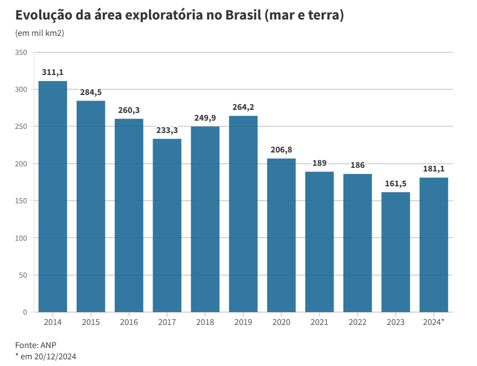 Os blocos offshore somaram uma área de 108 mil km², 40,25% maior que a área marítima explorada em 2023, que foi de 77 mil Km². A extensão corresponde a 60,2% de toda a área explorada em 2024 (terra e mar), que totalizou 181,1 mil km².