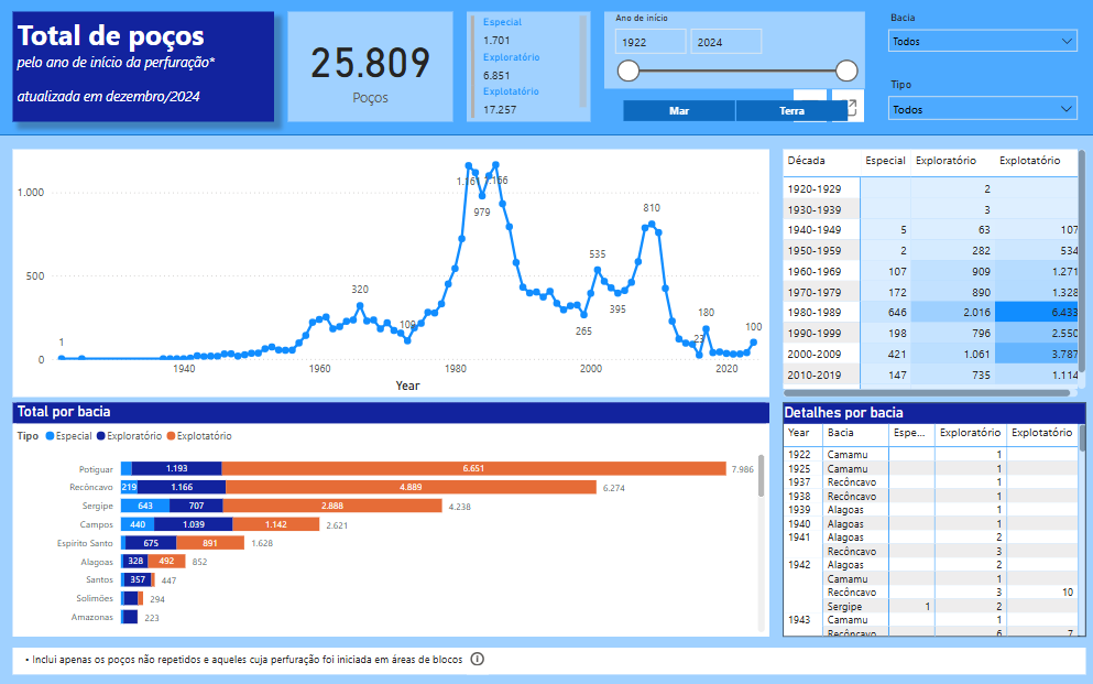 Veja no painel a evolução da perfuração de poços, com filtros para o tipo do poço, o ambiente e o ano: